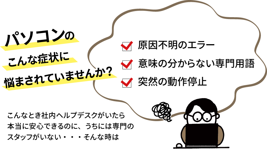 パソコン関係は問い合わせ先がとても複雑。物理的な故障は販売業者へ、ソフトウェアのトラブルはメーカーへ、回線トラブルならプロバイダへといった具合です。適切な窓口を判断するだけでさえ面倒。詳しい人に聞いてみるつもりで気軽にご利用ください。